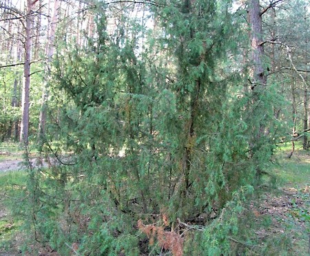 Aufgrund der stachligen Nadeln wurde der Wacholder von den hier weidenden Schafen gemieden und konnte sich verbreiten. Schäfer bekämpften ihn allerdings lange Zeit als „Weideunkraut“. Aufgrund seiner hohen Lebenserwartung konnte er jedoch in Teilbereichen bis heute überdauern. Die alte Heidelandschaft ist inzwischen durch Kiefernbestände ersetzt worden. Die im Wald stehenden Wacholdersträucher zeugen jedoch bis heute von der alten Kulturlandschaft der Heidebauern. Da Wacholder ausgesprochen lichtbedürftig sind, bewirkt die zunehmende Beschattung durch die hoch wachsenden Kiefern ein langsames Absterben der niedrigeren Wacholder. Unser Exemplar hier am Wegesrand hatte Glück, da das lichte Kronendach an dieser Stelle noch genügend Sonnenstrahlen freigibt. An dunkleren Orten kümmern die Pflanzen dahin, bis sie schließlich völlig absterben.